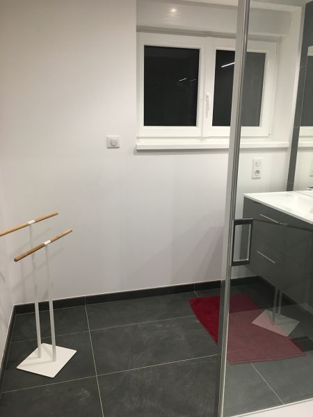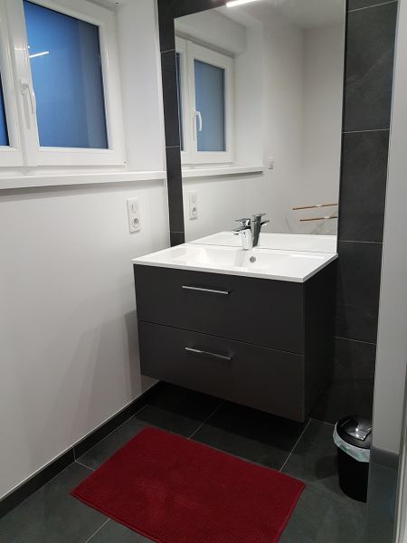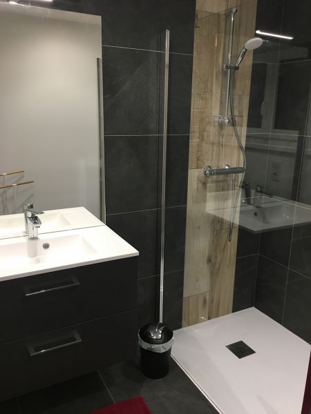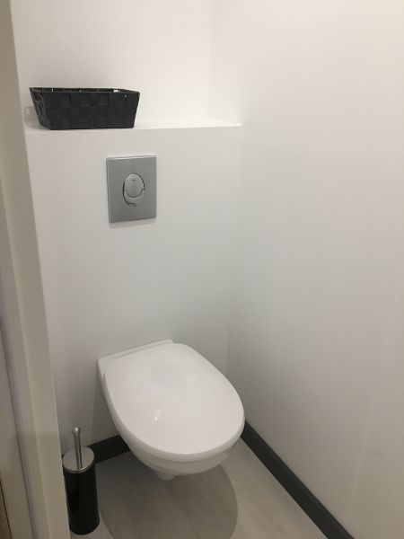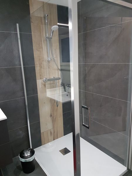 SDB avec douche, wc, lavabo et rangement + sèche-cheveux