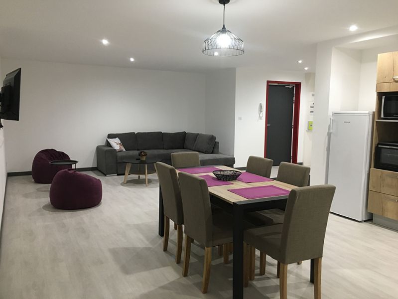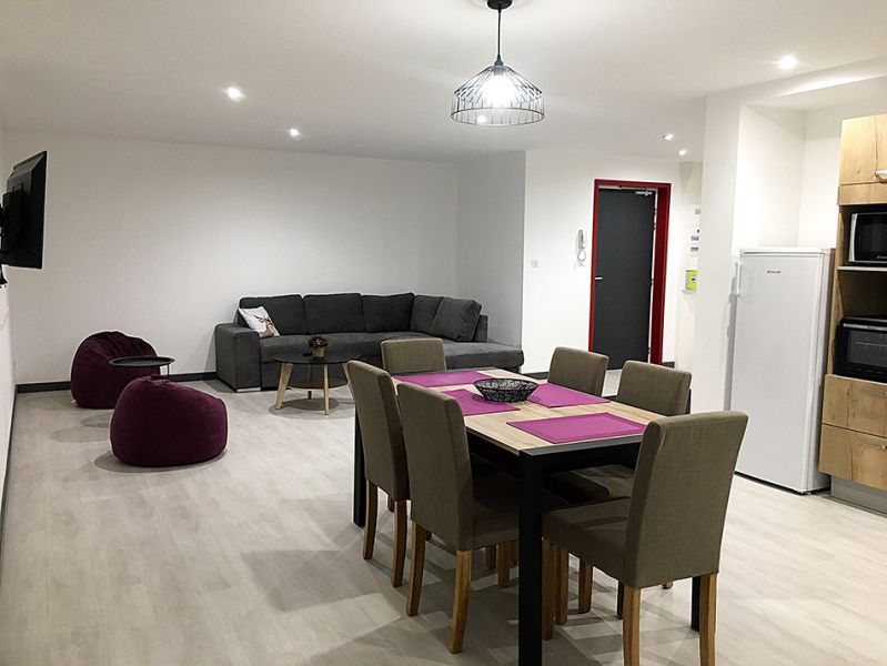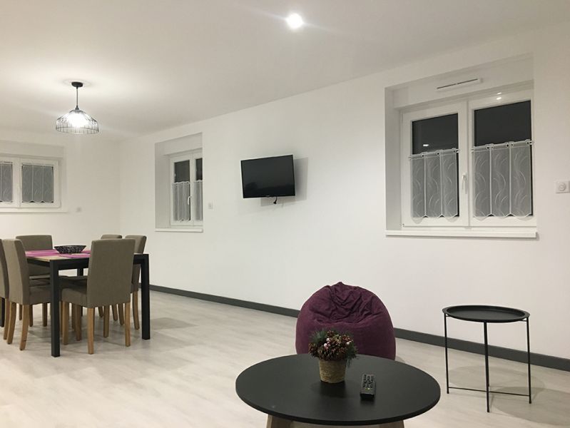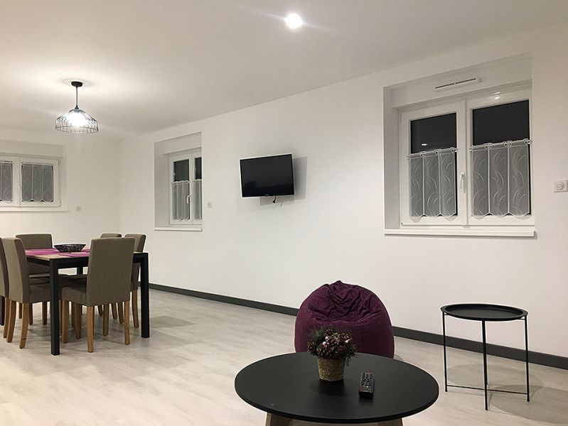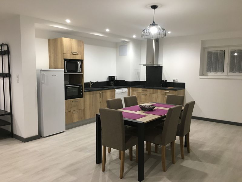 Avec belle entrée meuble chaussures et porte-manteaux donnant sur belle pièce à vivre ouverte sur 40m2 avec cuisine entièrement équipée (lave-vaisselle, hotte, induction, four, micro-ondes, grille-pain, bouilloire, cafetière + nécessaires pour 6 personnes)salon TV avec canapé convertible 2 couchages